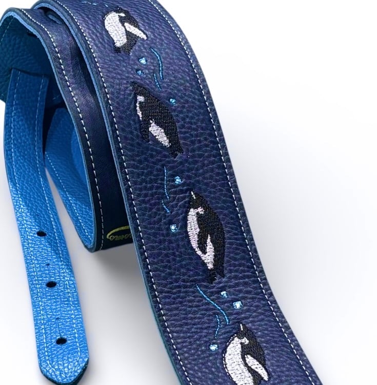 ペンギンの群れが澄んだ海をすいすいと泳ぐ姿が、まるで空を飛んでいるように見える優雅で可愛らしい刺繍を施したレザーストラップです。 楽器を構えた瞬間、胸元で小さな物語が始まります。 柔らかくてしなやかな革が特徴の牛革を使用したストラップです。 長時間の演奏でも肩や首への負担を軽減し、快適な演奏をサポートします。