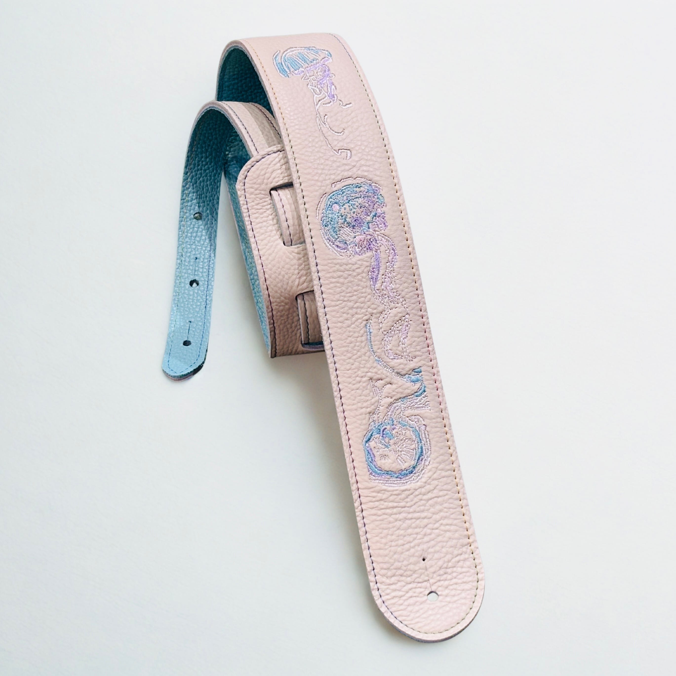 パステルカラーのクラゲが3匹ゆらゆら揺れながら海を漂う優雅で美しい刺繍を施したレザーストラップです。 柔らかくてしなやかな革が特徴の牛革を使用したストラップです。 長時間の演奏でも肩や首への負担を軽減し、快適な演奏をサポートします。